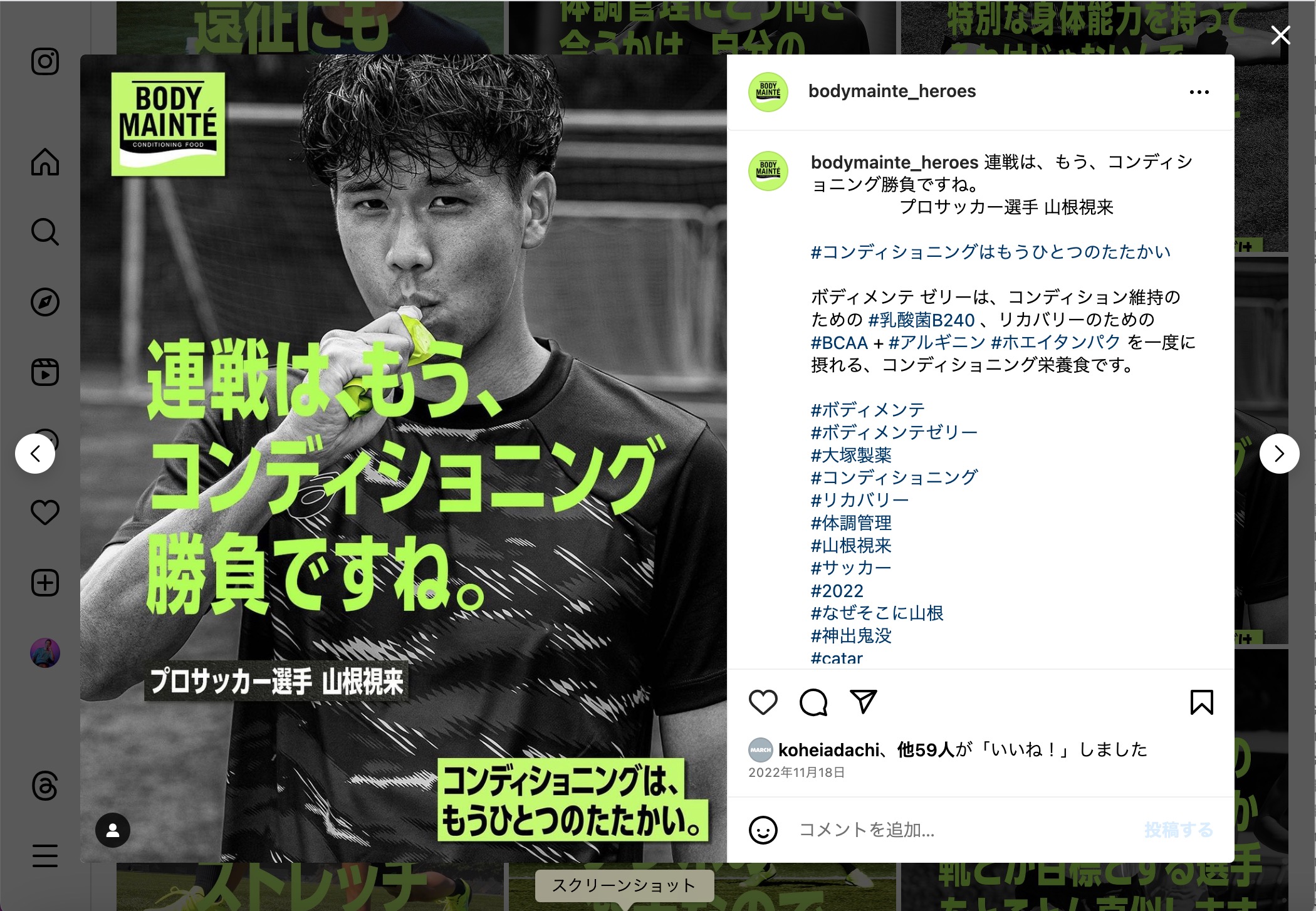 派手なパフォーマンスや、絵になるトレーニングとは違って スポットライトも当たらない。 かっこよくもない。地味な努力。 でも、 アスリートたちが心をくだき、時間をささげ、タイミングを考え抜き、 自分のカラダの法則を研究し尽くし、時に常人には理解し難い行動をとる。 それが、コンディショニング。 アスリートにとって、 コンディショニングは、 もうひとつのたたかいだ。 ボディメンテゼリーなら、コンディション維持のための乳酸菌B240、 そして、リカバリーのためのBCAA + アルギニン、ホエイタンパクを一度に摂れる。 さらに、常温のままでトレーニング直後の現場へも持ち運べる。 さあ、ボディメンテとともに、あなたの知らないスポーツとアスリートの側面を、 覗き見してみよう。 Instagramを中心にして、周辺へスポーツのインスピレーションを発信していくキャンペーン。