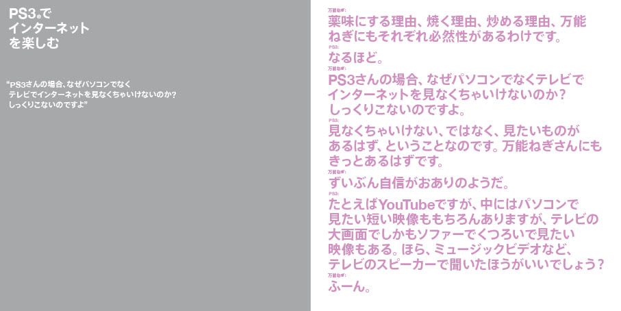 万能ねぎとPS3が万能について語り合う「世界万能対談」キャンペーン。対談CM、対談番組、対談本、対談生放送など。
